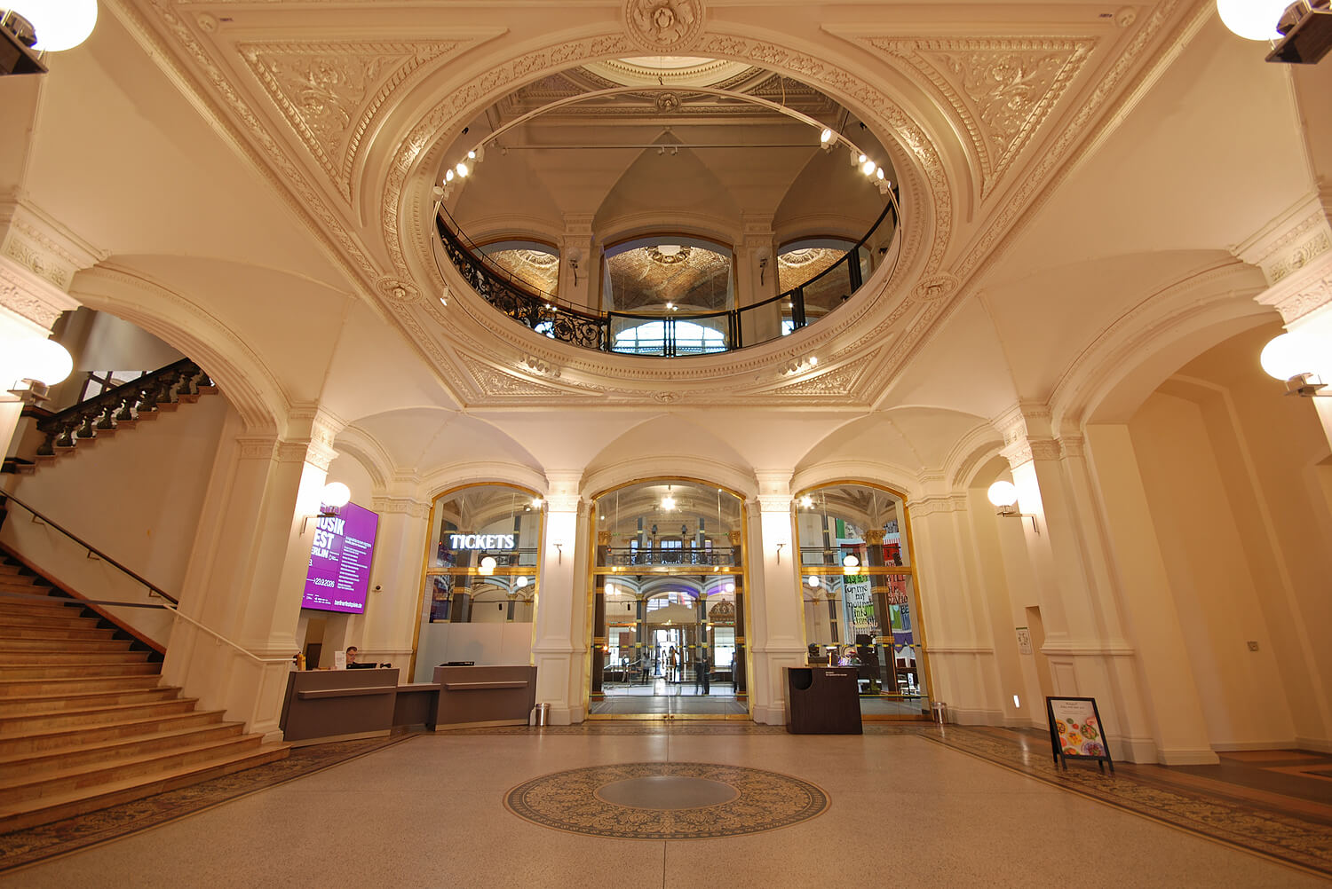 | Sollte es aber doch Mal eine Vorstellung geben, muss man durch den Haupteingang das Gebäude bertreten. Im wunderschönen Eingangsbereich mit Treppe zum Obergeschoss liegt die Kasse.