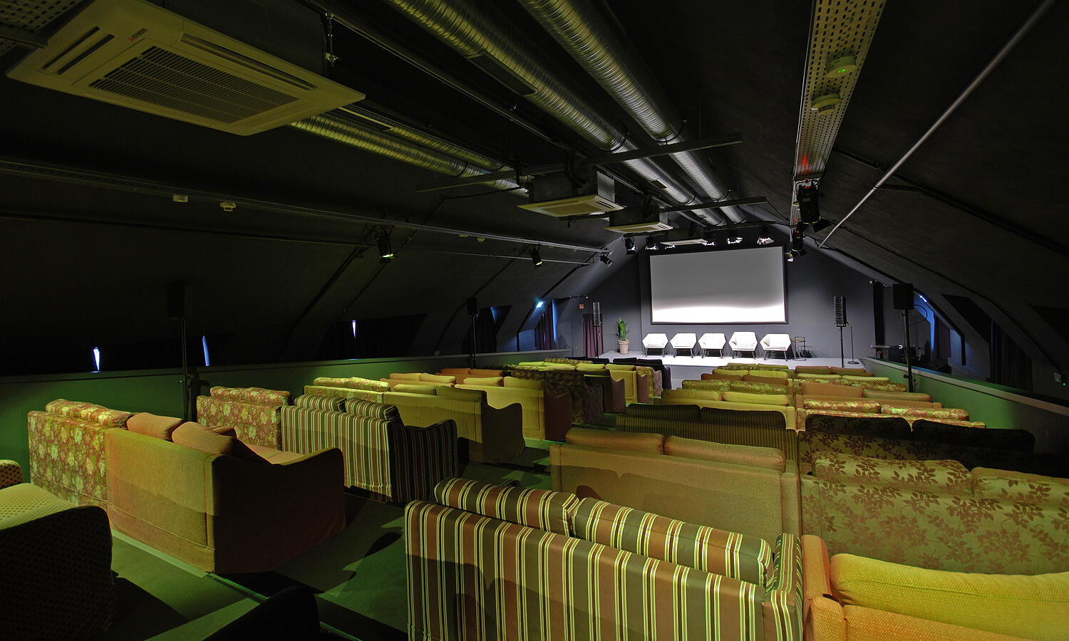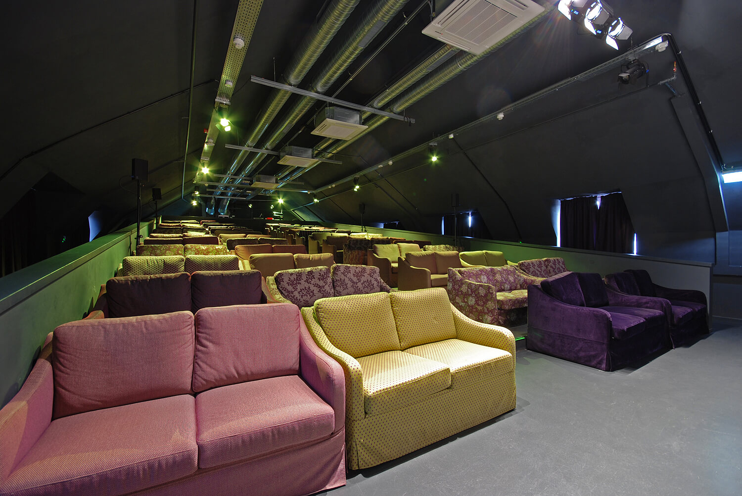 Über einen zentrierten Gang gelangt man in die 12 Reihen die jeweils vier bunte Sofas haben. So teilen sich also zwei Besucher ein Sofas und vier Leute können direkt nebeneinander sitzen. Im hinteren Bereich der Auframpung ist der Technikbereich.